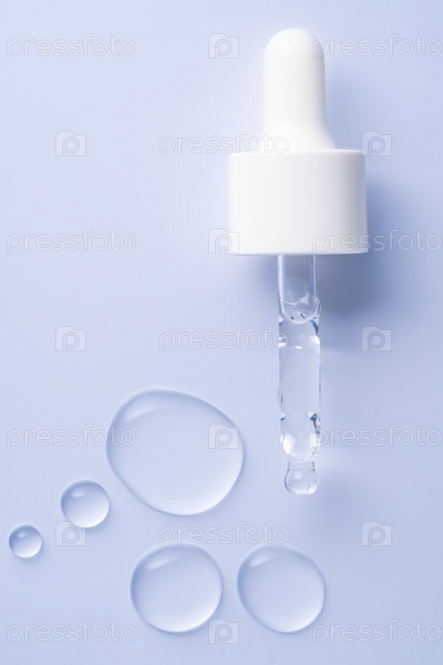Крупный план пипетки с каплями жидкой сыворотки с мягкими тенями на синем фоне. Модный косметический снимок
