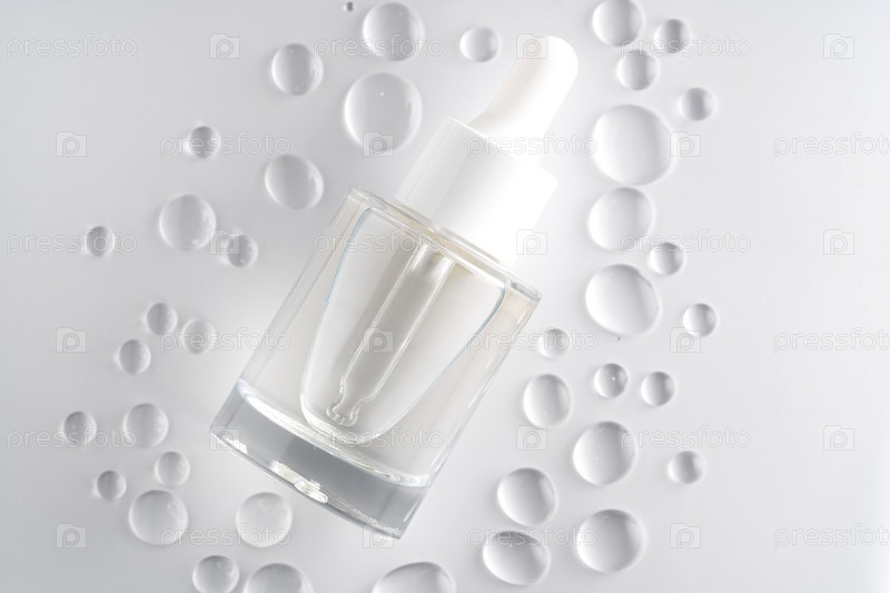 Увлажняющая сыворотка в стеклянном флаконе с капельницей на белом фоне. Вид сверху, плоская планировка, макет