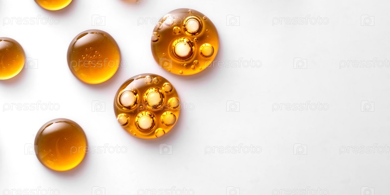 Капли желтого масла образец текстуры макрос с пузырьками, косметика для лица и тела, наука, лаборатория, изолированные на белом фоне
