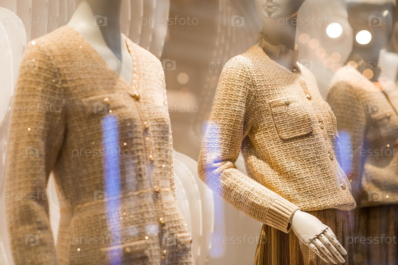 Элегантная витрина дорогого люксового магазина со стильными манекенами в одежде и вечерним освещением. Концепция шопинга и распродаж