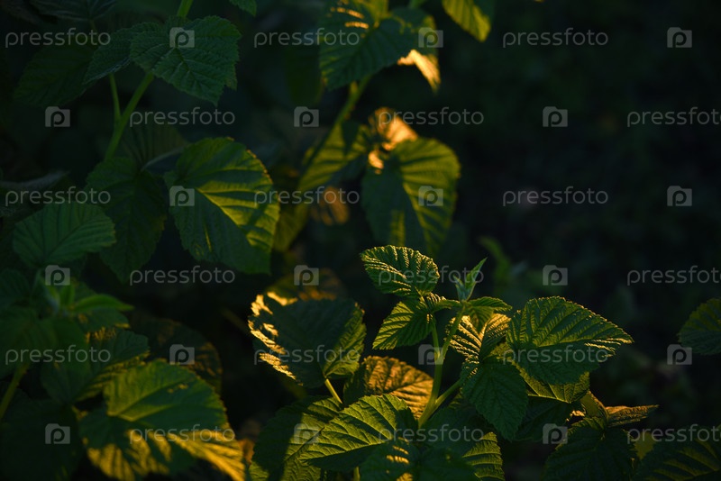 Листья малины в свете заходящего солнца. Зеленые листья