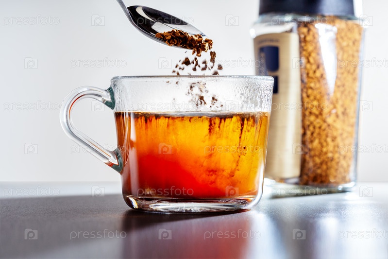 Наливает растворимый кофе с ложки в кофейную чашку. растворимый кофе