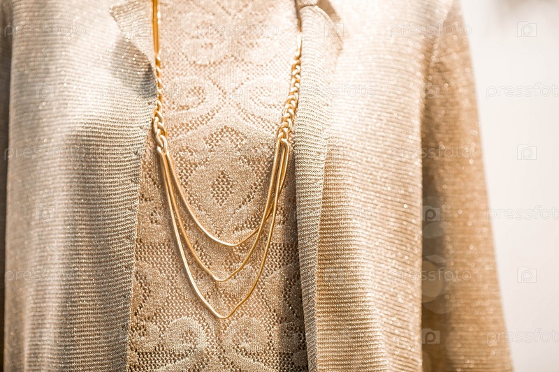 Элегантная витрина дорогого люксового магазина со стильными манекенами в одежде и вечерним освещением. Концепция шопинга и распродаж