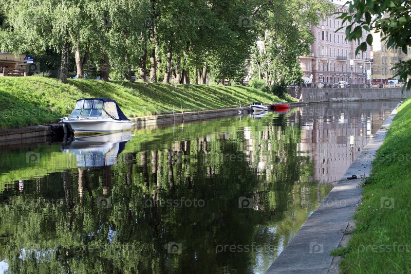 Отражение зеленых деревьев в тихой воде канала и пришвартованные лодки