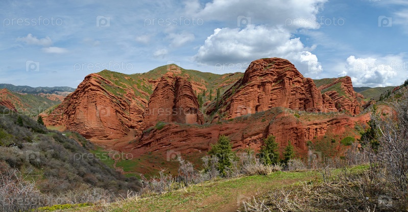Кыргызстан, юго-восточное побережье озера Иссык-Куль. Вид на окаменевшие глинистые скалы Джети-Огуза, известные своим ярко-красным цветом
