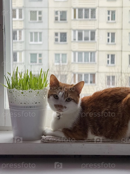 Рыжий кот лежит на подоконнике рядом с горшком зеленой травы. Подсветка из окна