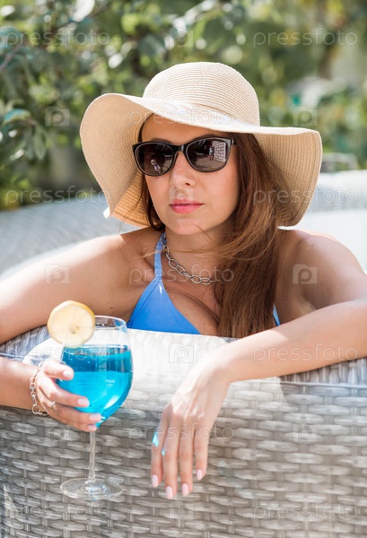 Молодая женщина в купальнике и солнцезащитных очках в джакузи со стаканом коктейля Blue Lagoon на фоне бассейна.Концепция летних каникул, отпуска и пенной вечеринки