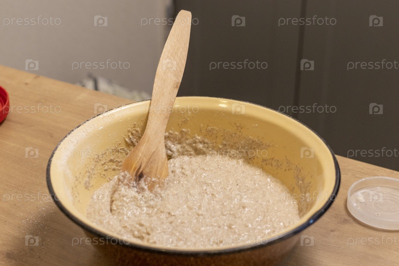 Крупным планом снимок теста в миске на кухонной столешнице. Выпечка
