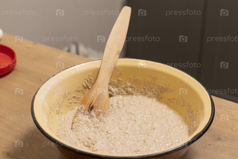 Крупным планом снимок теста в миске на кухонной столешнице. Выпечка