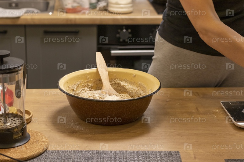 Крупным планом снимок теста в миске на кухонной столешнице. Выпечка