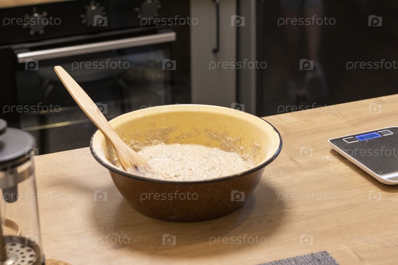 Крупным планом снимок теста в миске на кухонной столешнице. Выпечка