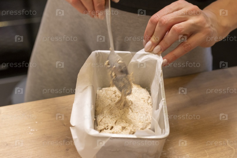 Женщина кладет тесто в форму для выпечки хлеба на кухонной столешнице. Выпечка