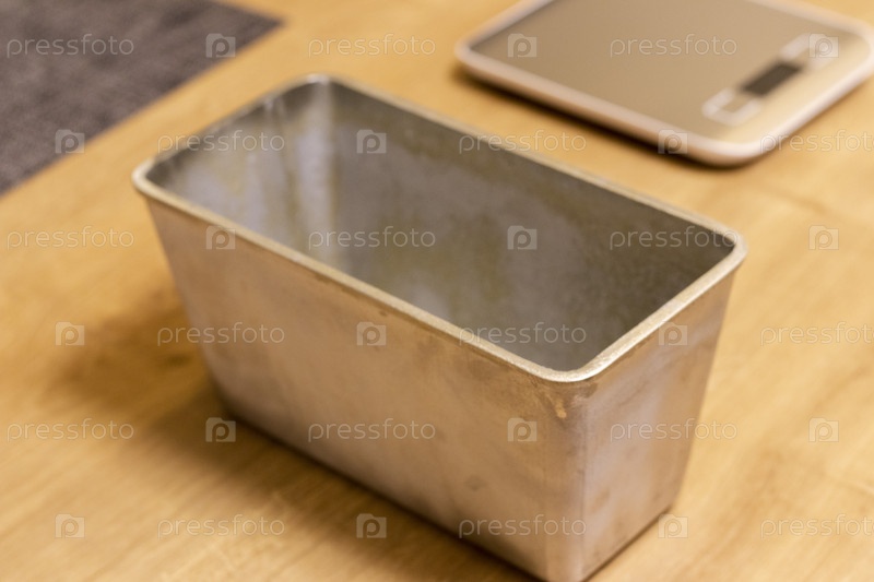 Крупным планом вид на форму для выпечки хлеба на кухонной столешнице. Выпечка