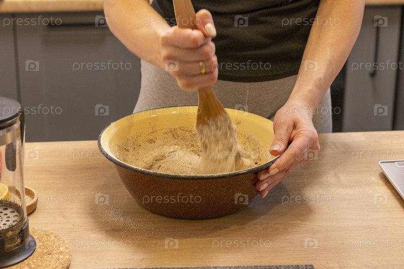 Женщина замешивает тесто в миске. Выпечка