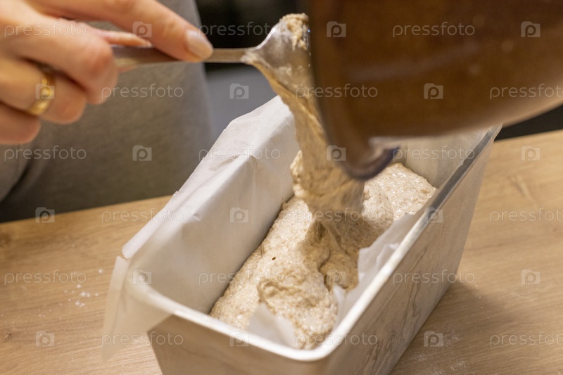 Женщина кладет тесто в форму для выпечки хлеба на кухонной столешнице. Выпечка