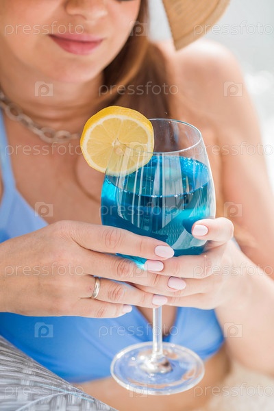 Молодая женщина в купальнике и солнцезащитных очках в джакузи со стаканом коктейля Blue Lagoon на фоне бассейна.Концепция летних каникул, отпуска и пенной вечеринки
