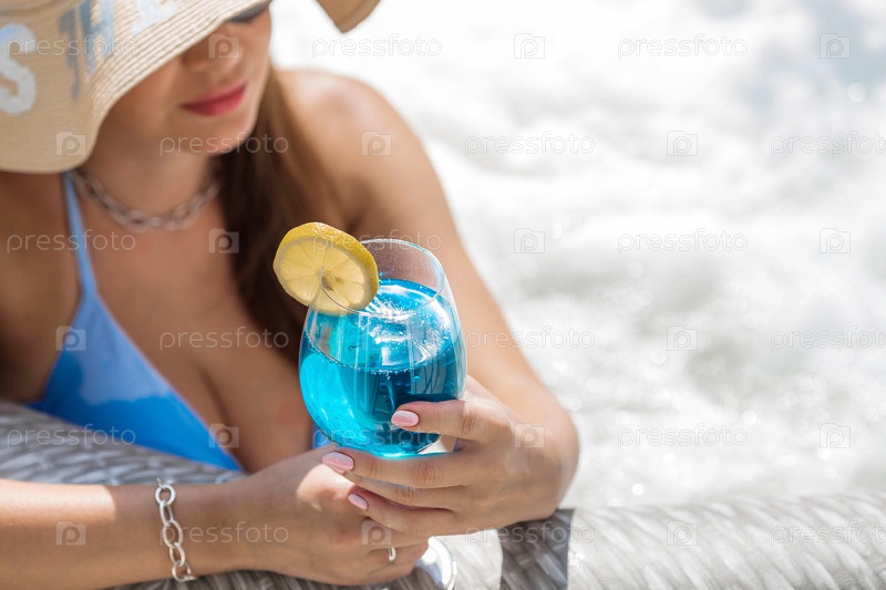 Молодая женщина в купальнике и солнцезащитных очках в джакузи со стаканом коктейля Blue Lagoon на фоне бассейна.Концепция летних каникул, отпуска и пенной вечеринки