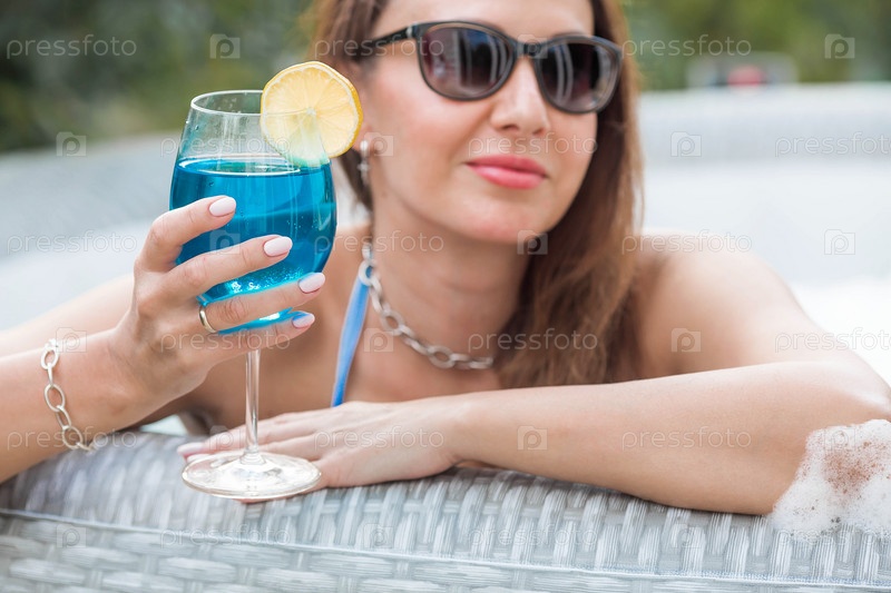 Молодая женщина в купальнике и солнцезащитных очках в джакузи со стаканом коктейля Blue Lagoon на фоне бассейна.Концепция летних каникул, отпуска и пенной вечеринки