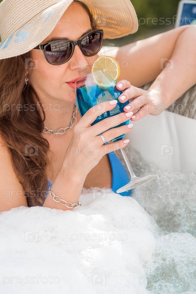 Молодая женщина в купальнике и солнцезащитных очках в джакузи со стаканом коктейля Blue Lagoon на фоне бассейна.Концепция летних каникул, отпуска и пенной вечеринки