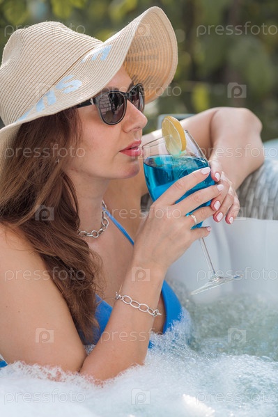 Молодая женщина в купальнике и солнцезащитных очках в джакузи со стаканом коктейля Blue Lagoon на фоне бассейна.Концепция летних каникул, отпуска и пенной вечеринки