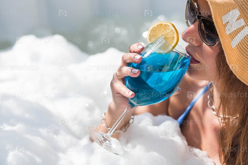 Молодая женщина в купальнике и солнцезащитных очках в джакузи со стаканом коктейля Blue Lagoon на фоне бассейна.Концепция летних каникул, отпуска и пенной вечеринки