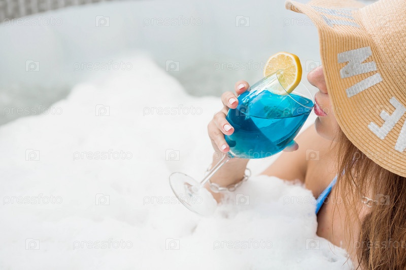 Молодая женщина в купальнике и солнцезащитных очках в джакузи со стаканом коктейля Blue Lagoon на фоне бассейна.Концепция летних каникул, отпуска и пенной вечеринки