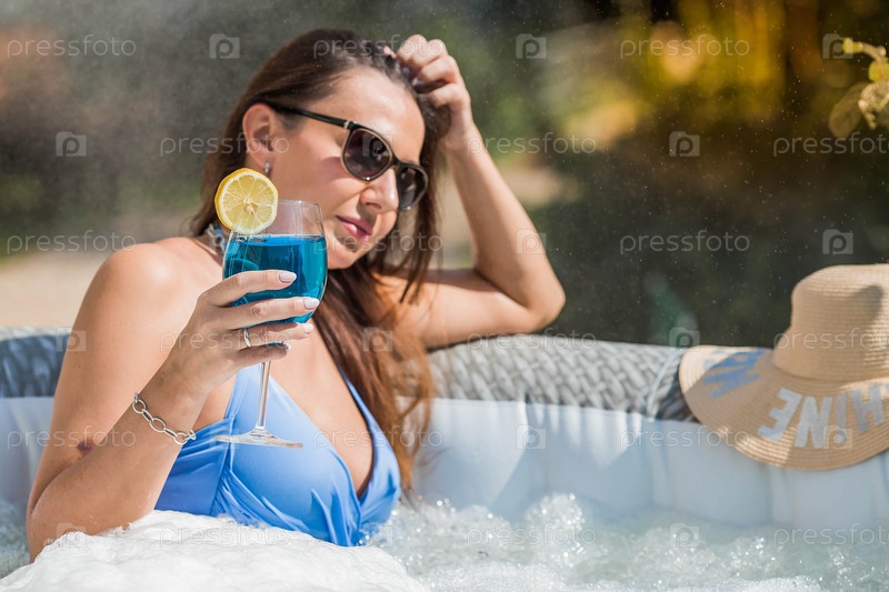 Молодая женщина в купальнике и солнцезащитных очках в джакузи со стаканом коктейля Blue Lagoon на фоне бассейна.Концепция летних каникул, отпуска и пенной вечеринки