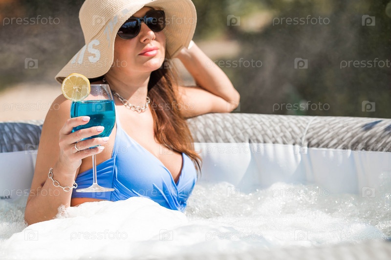 Молодая женщина в купальнике и солнцезащитных очках в джакузи со стаканом коктейля Blue Lagoon на фоне бассейна.Концепция летних каникул, отпуска и пенной вечеринки