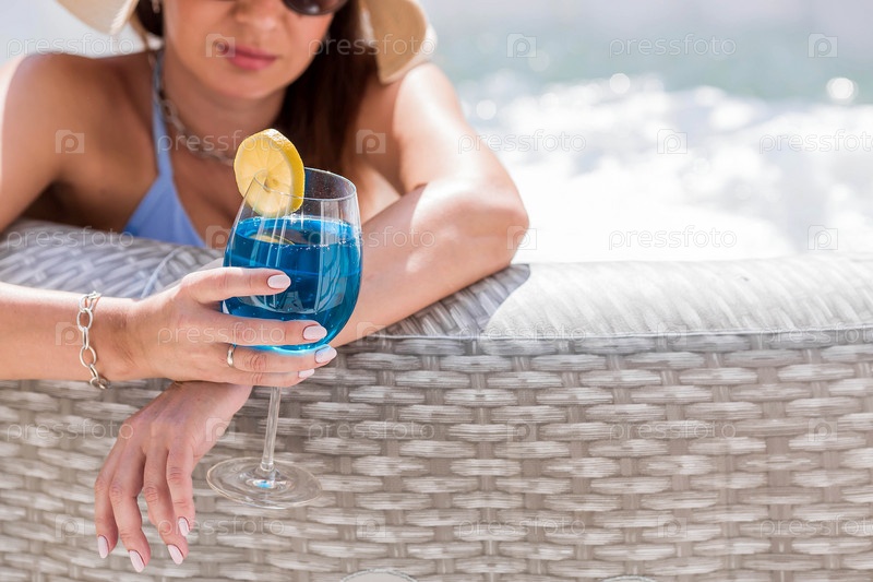 Молодая женщина в купальнике и солнцезащитных очках в джакузи со стаканом коктейля Blue Lagoon на фоне бассейна.Концепция летних каникул, отпуска и пенной вечеринки