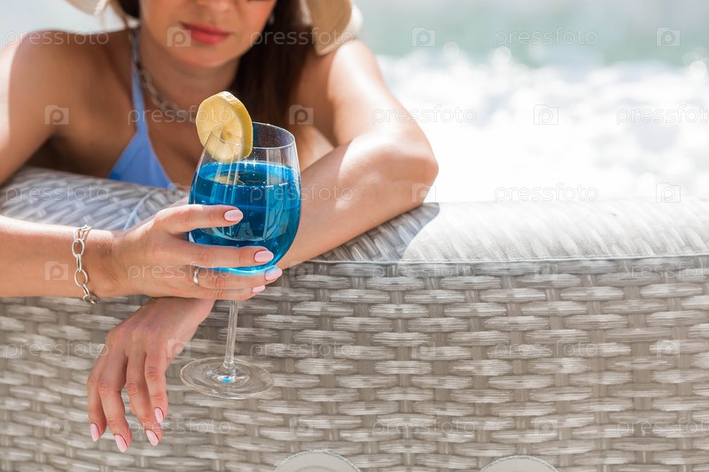 Молодая женщина в купальнике и солнцезащитных очках в джакузи со стаканом коктейля Blue Lagoon на фоне бассейна.Концепция летних каникул, отпуска и пенной вечеринки