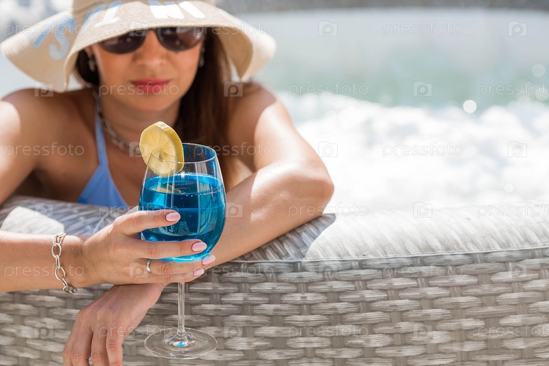 Молодая женщина в купальнике и солнцезащитных очках в джакузи со стаканом коктейля Blue Lagoon на фоне бассейна.Концепция летних каникул, отпуска и пенной вечеринки