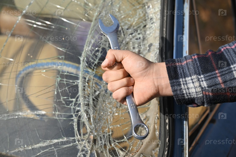 Ремонт старого автомобиля, попавшего в аварию, с разбитым лобовым стеклом