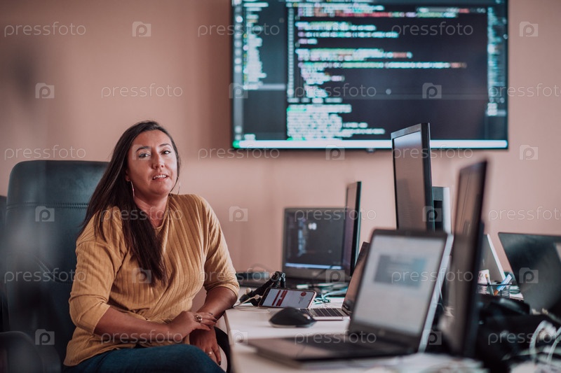 Бизнес-леди сидит в офисе программиста в окружении компьютеров, демонстрируя свою компетентность и преданность технологиям