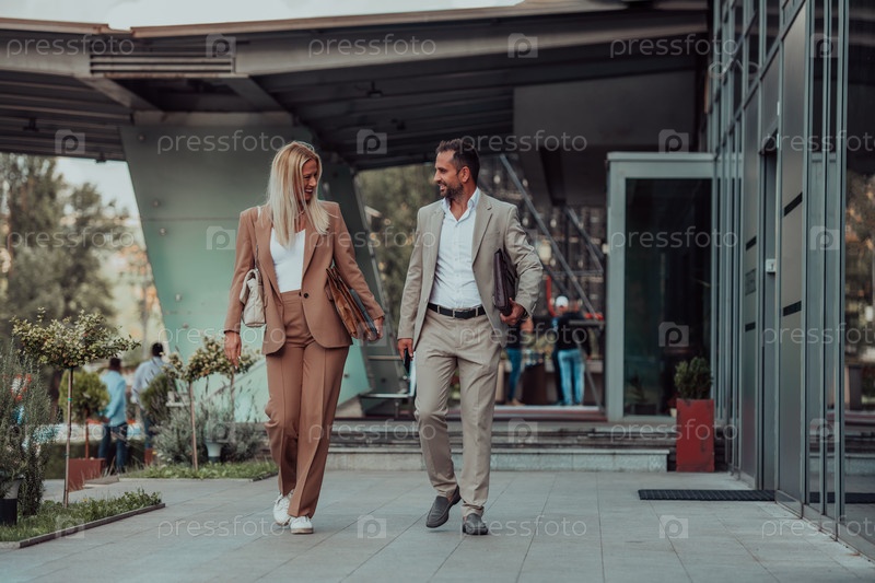 Современная деловая пара после долгого рабочего дня вместе направляется к своему уютному дому, воплощая идеальное сочетание профессионального успеха и личного удовлетворения