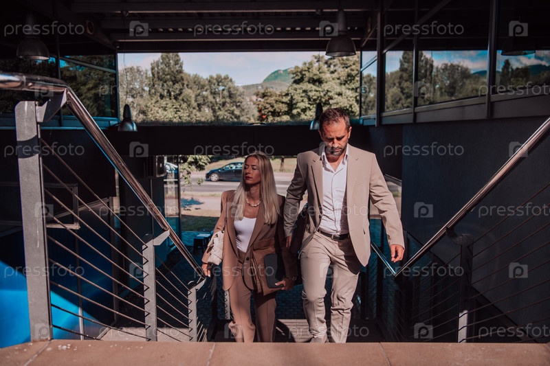 Современная деловая пара после долгого рабочего дня вместе направляется к своему уютному дому, воплощая идеальное сочетание профессионального успеха и личного удовлетворения