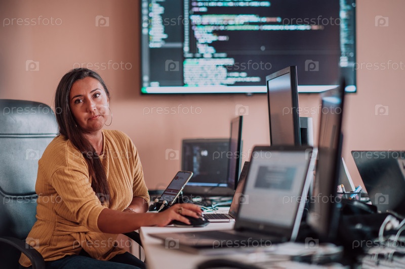 Бизнес-леди сидит в офисе программиста в окружении компьютеров, демонстрируя свою компетентность и преданность технологиям