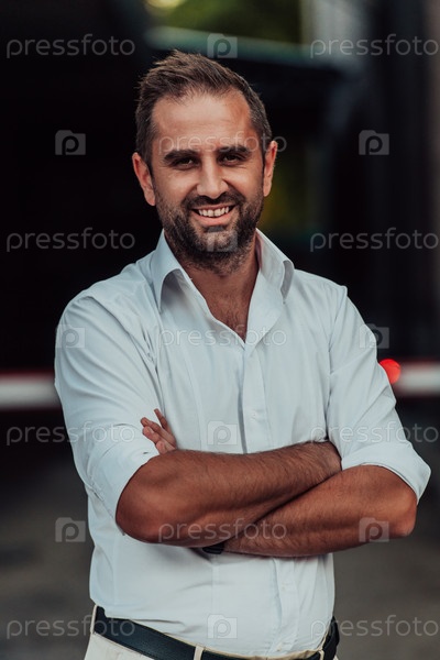 Успешный бизнесмен в белой рубашке со скрещенными руками позирует на открытом воздухе