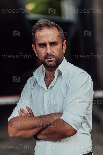 Успешный бизнесмен в белой рубашке со скрещенными руками позирует на открытом воздухе