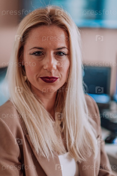 Бизнес-леди сидит в офисе программиста в окружении компьютеров, демонстрируя свою компетентность и преданность технологиям