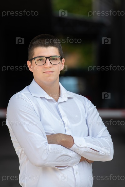 Успешный бизнесмен в белой рубашке, скрестив руки, позирует на открытом воздухе с уверенным выражением лица