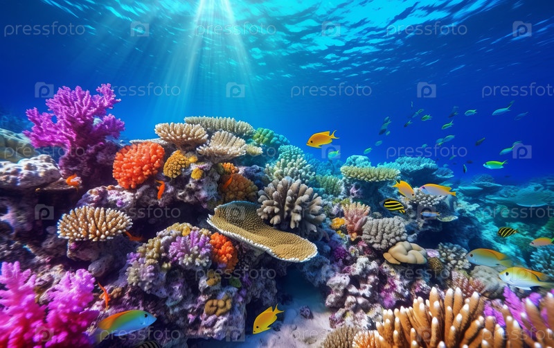 Небольшой подводный каньон, прорезанный волной в переднем рифе, с солнечным светом, проникающим сквозь поверхность воды