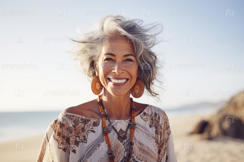 Портрет улыбающейся женщины, закутанной в одеяло на пляже