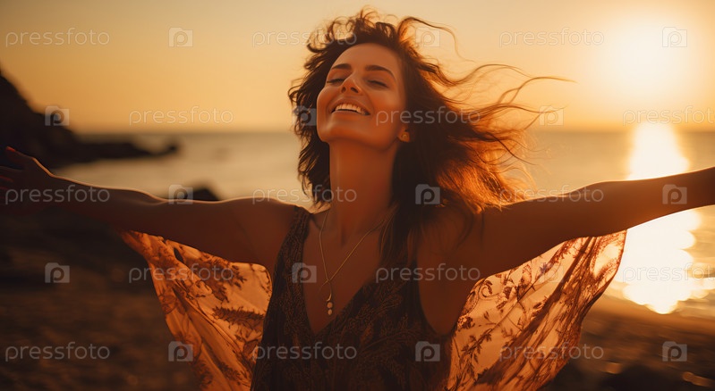 Женщина позирует с вытянутыми вперед руками перед солнцем