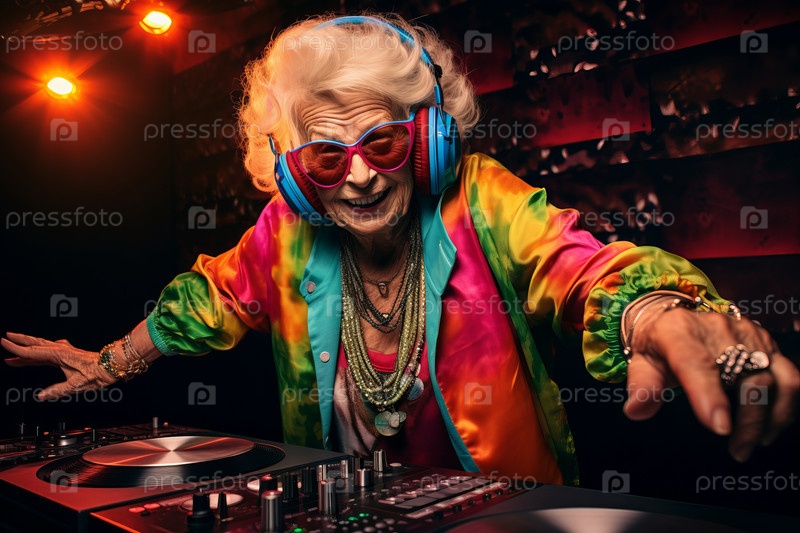 Удивительная бабушка-диджей, пожилая дама играет диджеем и развлекается в стиле диско