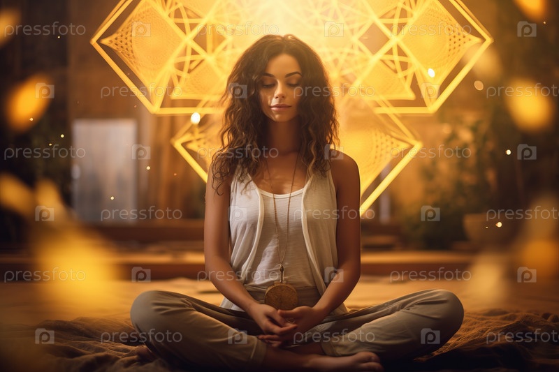 Здоровая спокойная молодая женщина медитирует дома с закрытыми глазами, расслабляя тело и разум, сидя на полу в гостиной. Психическое здоровье и медитация без стресса