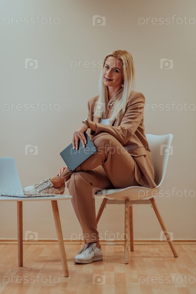 Профессиональная бизнес-леди сидит на стуле на спокойном бежевом фоне, усердно работая на своем ноутбуке, демонстрируя преданность делу и сосредоточенность на достижении успеха