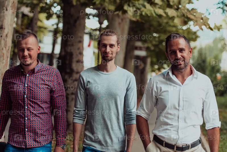 После продуктивного рабочего дня группа коллег из разных слоев общества наслаждается неторопливой прогулкой по современному и естественному городскому ландшафту