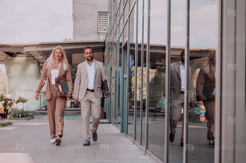 Современная деловая пара после долгого рабочего дня вместе направляется к своему уютному дому, воплощая идеальное сочетание профессионального успеха и личного удовлетворения