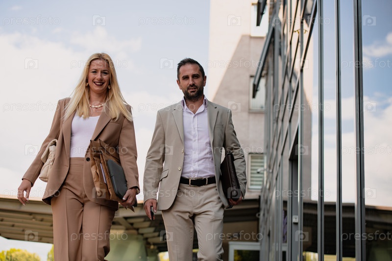 Современная деловая пара после долгого рабочего дня вместе направляется к своему уютному дому, воплощая идеальное сочетание профессионального успеха и личного удовлетворения