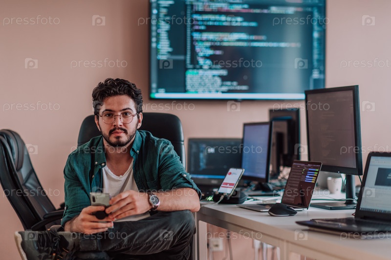 Программист усердно тестирует приложения для смартфонов, сидя в своем офисе